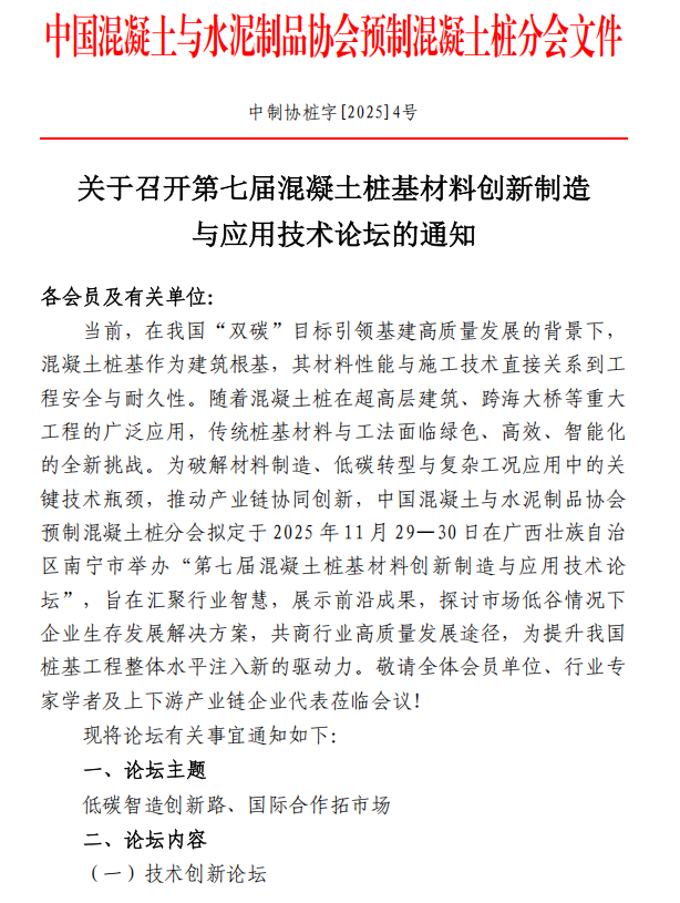 桩业通知:第七届混凝土桩基材料创新制造与应用技术论坛 即将召开!
